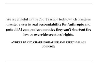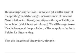Anthropic avoids "Bartz II" piracy claim sought by Concord Music. Major win.